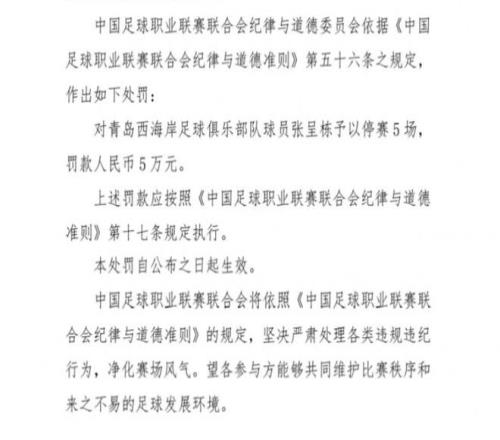 北京时间10月22日,中足联发布官方通告,青岛西海岸球员张呈栋因辱骂裁判,被禁赛五场,罚款五万,而加上青岛西海岸此前做出的内部处罚,张呈栋一共被罚款10万元、停赛5场,同时队内“三停”。